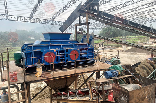 對輥破碎機通過輥輪進行破碎作業(yè)。物料由進料口進入輥子之間,通過擠壓作用破碎河卵石,兩輥輪之間有一定的間隙,兩輥輪間隙變大,物料出料粒度變大,在壓緊彈簧的作用下兩輥輪間隙變小,出料粒度變小。通過改變調(diào)整間隙,可以控制物料的出料粒度。